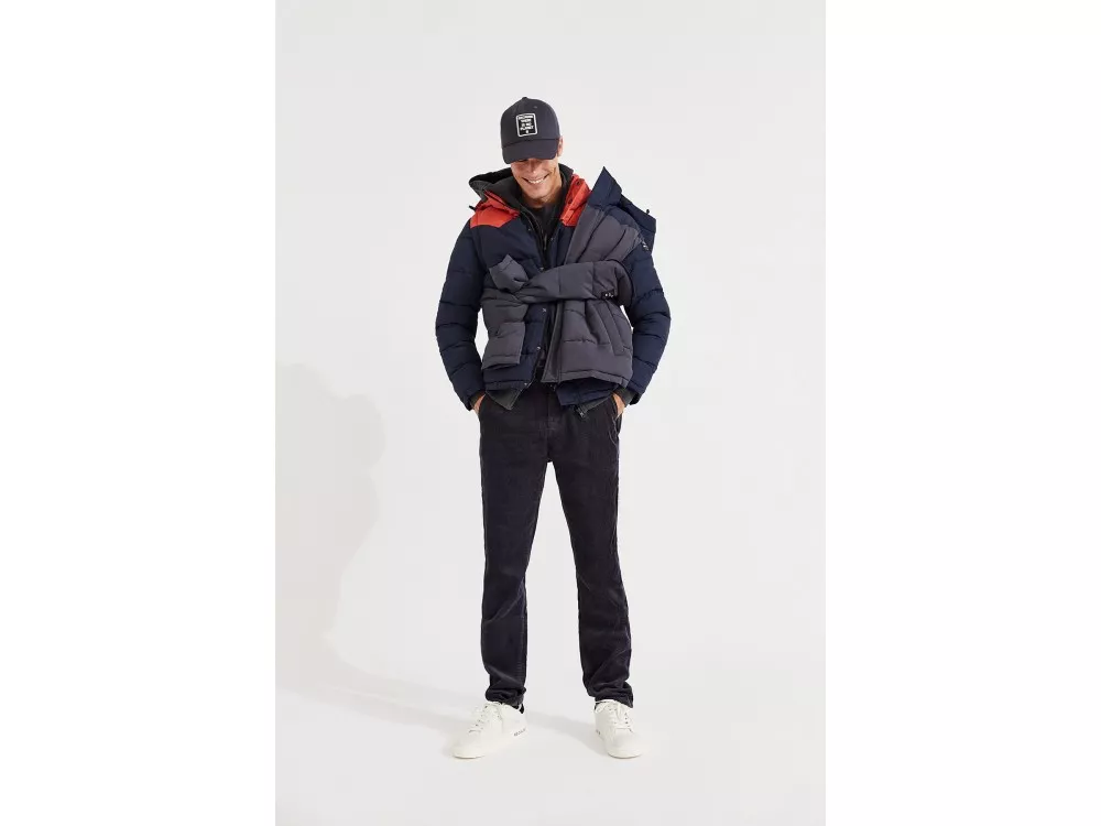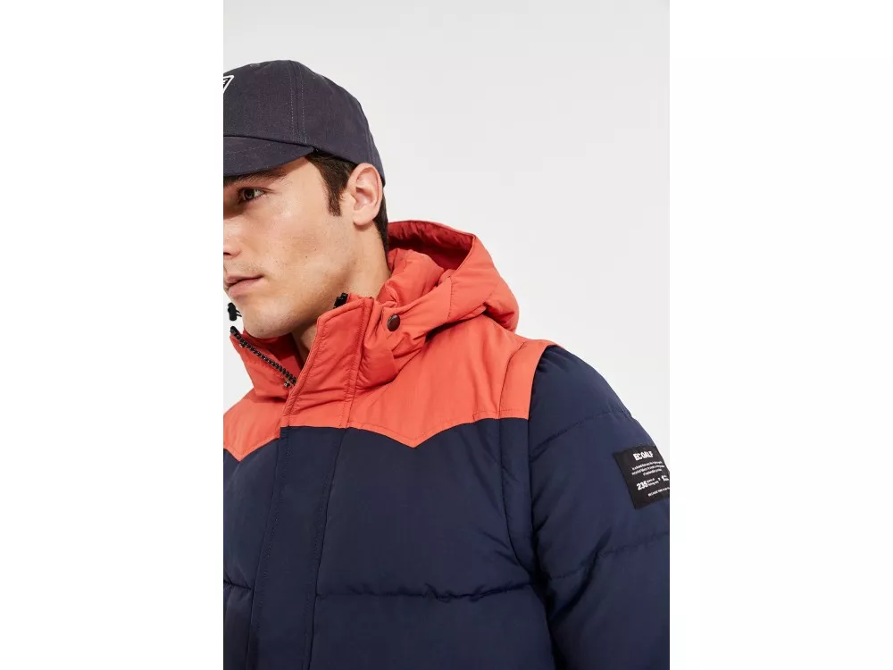 Casaco de Inverno de homem azul escuro da nova colecção Ecoalf sustentável. Acolchoado com penas sintéticas Fellex® recicladas, o forro é 100% de nylon reciclado e tecido com certificação bluesign®, onde todo o processo de produção é seguido e satisfaz a máxima qualidade com o mínimo consumo de recursos. Mantém-no aquecido com um fecho de correr e um fecho de pino até ao pescoço. O casaco acolchoado não só é útil em tempo frio, mas graças à sua impermeabilidade, mesmo a chuva forte não o apanhará de surpresa. Cumpre os requisitos veganos e está livre de produtos químicos PFC nocivos.