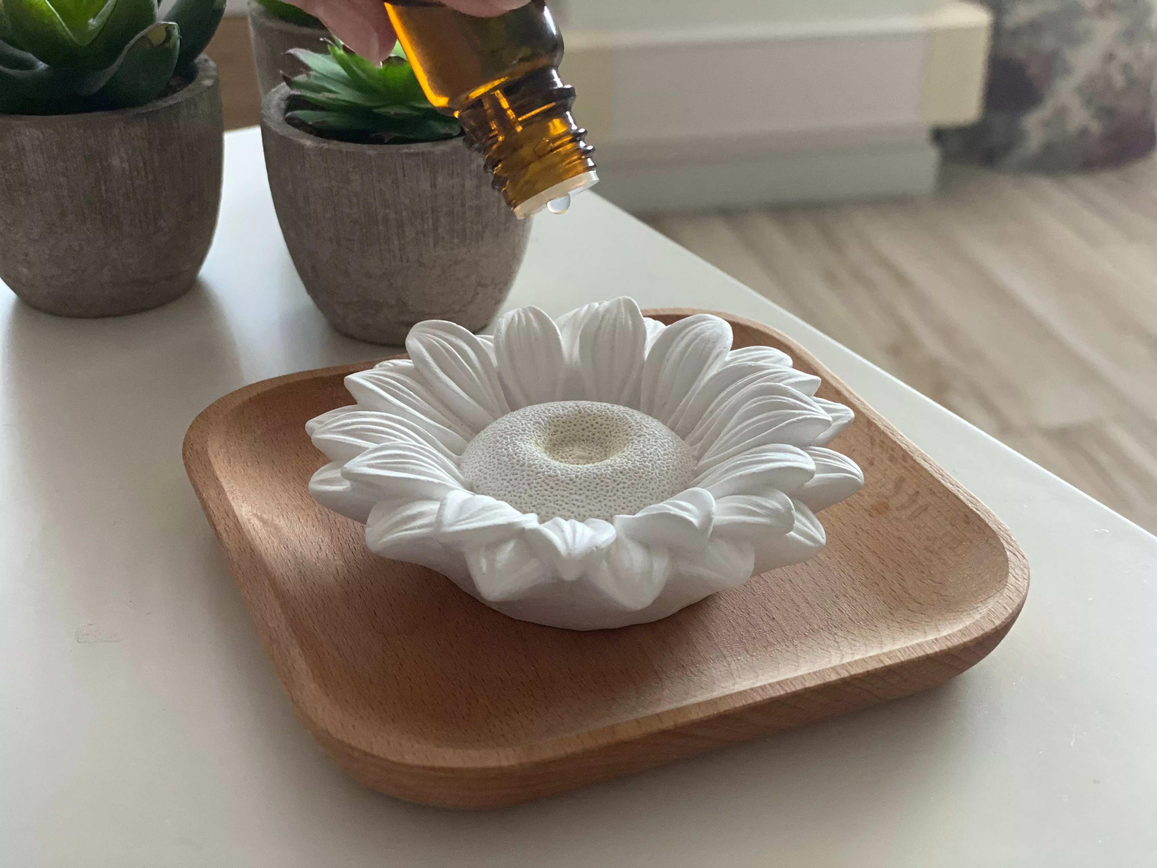 Flor branca em base de madeira será um complemento encantador para a casa e ao mesmo tempo proporcionará uma suave fragrância ao ambiente. O uso é muito simples - basta algumas gotas de óleo essencial 100% natural e a flor liberará sua fragrância naturalmente ao redor.